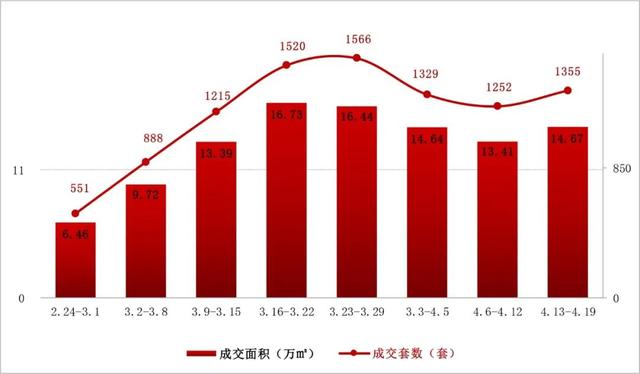 上周(4.13-4.19)长春商品住宅市场成交面积约14.67万㎡,成交套数约1355套;