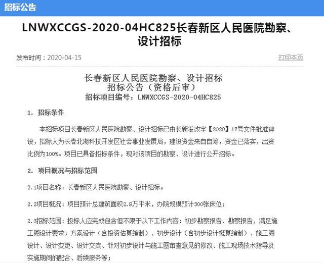 近日,吉林省建设信息网上发布了关于长春新区人民医院勘察设计招标公告,北湖区未来将迎新医院?