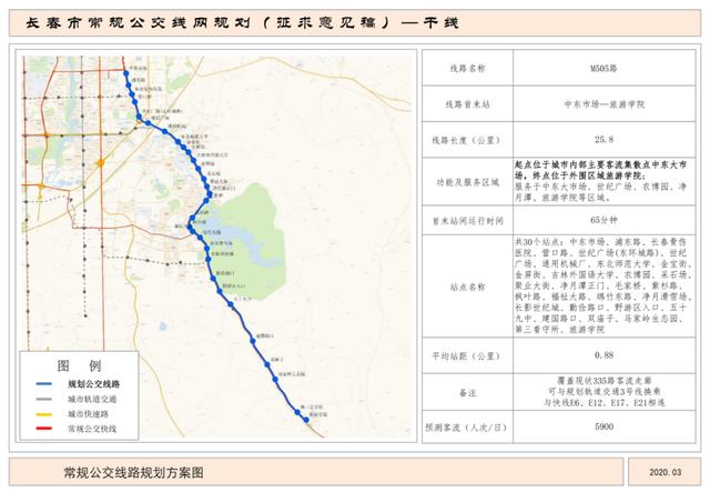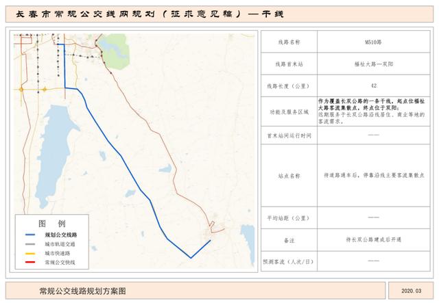 前段时间,长春市交通运输局就长春市公交线网规划中的10条外围辐射性“干线”征求意见,其中,双阳相关的就有2条,分别是现状线路M505路(中东市场-旅游学院),新增线路M510路(福祉大路-双阳)。